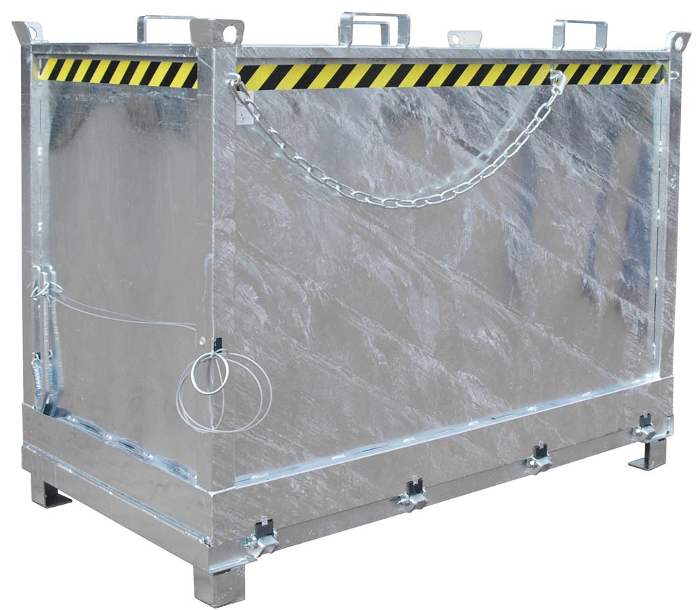 ∙ Entriegelung der Bodenklappe per Seilzug vom Stapler aus ∙ Bodenklappe schließt beim Aufsetzen selbsttätig, 90° Öffnungsbereich ∙ Sicherung für Bodenklappe gegen Abrutschen und ungewünschtes Öffnen ∙ Aufnahme für Gabelstapler und Kran sowie mit Gabelhubwagen transportierbar ∙ Robuste Stahlblechkonstruktion: Wandstärke 3 mm, Bodenklappenstärke 4 mm ∙ Einfahrbügel an der Oberseite des Behälters, Einfahrtaschen an der Unterseite · Unterfahrhöhe 100 mm