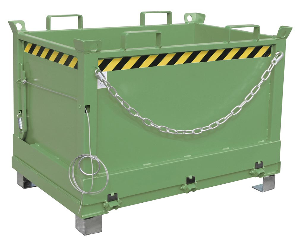 ∙ Entriegelung der Bodenklappe per Seilzug vom Stapler aus ∙ Bodenklappe schließt beim Aufsetzen selbsttätig, 90° Öffnungsbereich ∙ Sicherung für Bodenklappe gegen Abrutschen und ungewünschtes Öffnen ∙ Aufnahme für Gabelstapler und Kran sowie mit Gabelhubwagen transportierbar ∙ Robuste Stahlblechkonstruktion: Wandstärke 3 mm, Bodenklappenstärke 4 mm ∙ Einfahrbügel an der Oberseite des Behälters, Einfahrtaschen an der Unterseite · Unterfahrhöhe 100 mm
