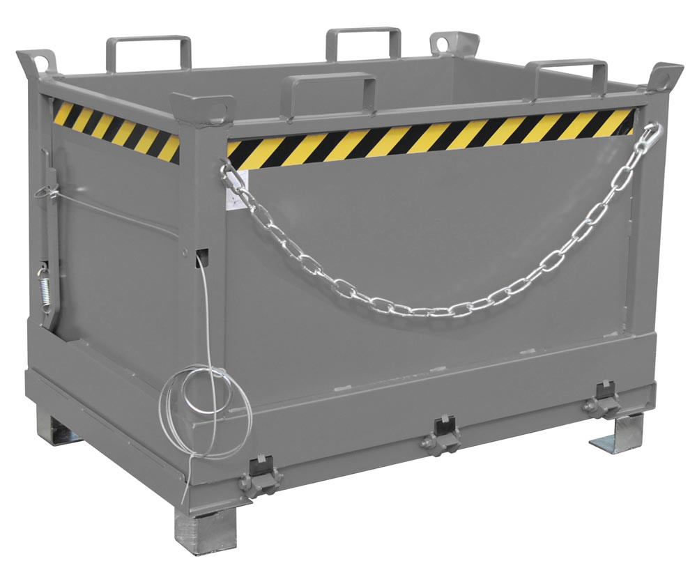 ∙ Entriegelung der Bodenklappe per Seilzug vom Stapler aus ∙ Bodenklappe schließt beim Aufsetzen selbsttätig, 90° Öffnungsbereich ∙ Sicherung für Bodenklappe gegen Abrutschen und ungewünschtes Öffnen ∙ Aufnahme für Gabelstapler und Kran sowie mit Gabelhubwagen transportierbar ∙ Robuste Stahlblechkonstruktion: Wandstärke 3 mm, Bodenklappenstärke 4 mm ∙ Einfahrbügel an der Oberseite des Behälters, Einfahrtaschen an der Unterseite · Unterfahrhöhe 100 mm