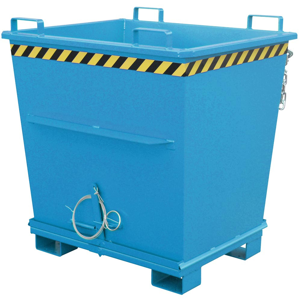 ∙ Entriegelung der Bodenklappe per Seilzug vom Stapler aus ∙ Bodenklappe schließt beim Aufsetzen selbsttätig, 90° Öffnungsbereich ∙ Sicherung für Bodenklappe gegen Abrutschen und ungewünschtes Öffnen ∙ Aufnahme für Gabelstapler und Kran sowie mit Gabelhubwagen transportierbar ∙ Robuste Stahlblechkonstruktion: Wandstärke 3 mm, Bodenklappenstärke 4 mm ∙ Einfahrbügel an der Oberseite des Behälters, Einfahrtaschen an der Unterseite · Unterfahrhöhe 100 mm