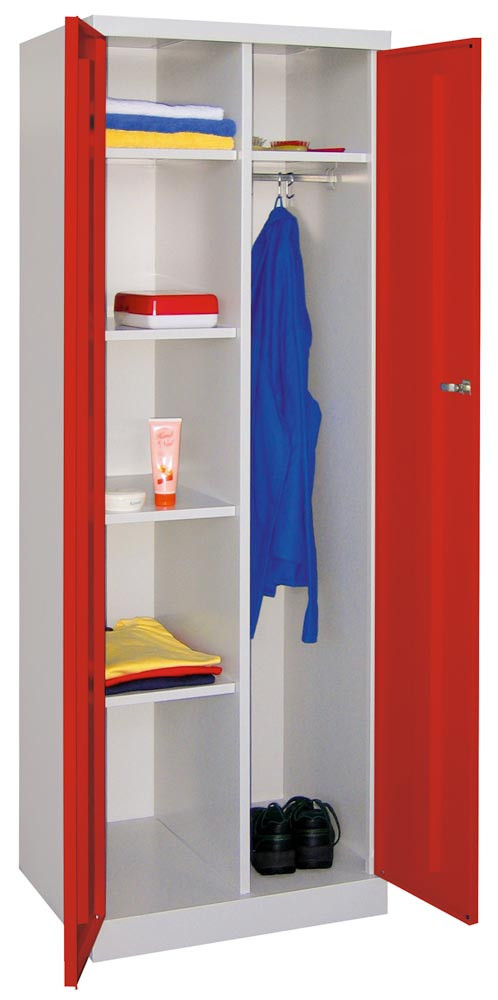 Kleider-Wäscheschrank mit Sockel, mittig Trennw., li. 4, re 1 Boden und Stange mit 3 Haken, BxTxH 600x500x1800 mm, RAL 7035/3000