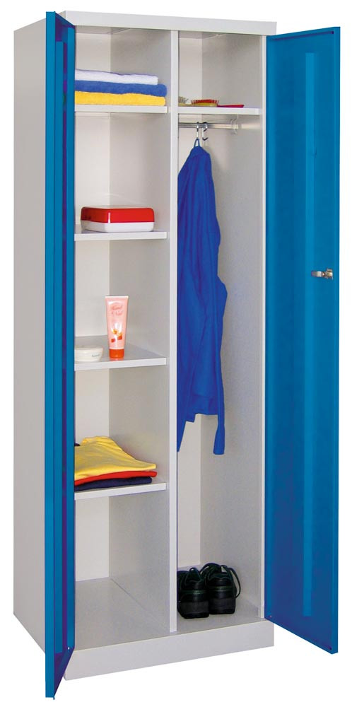 Kleider-Wäscheschrank mit Sockel, mittig Trennw., li. 4, re 1 Boden und Stange mit 3 Haken, BxTxH 600x500x1800 mm, RAL 5010 E1572313