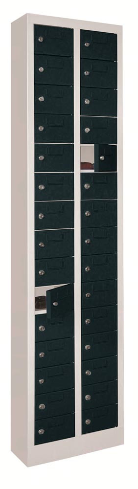 Kleinfachschrank, BxTxH 460x200x1950 mm, 2x15 Fächer, Fachbreite 145 mm, Schloss, Sockel, RAL 7035/7016 lichtgrau/anthrazit