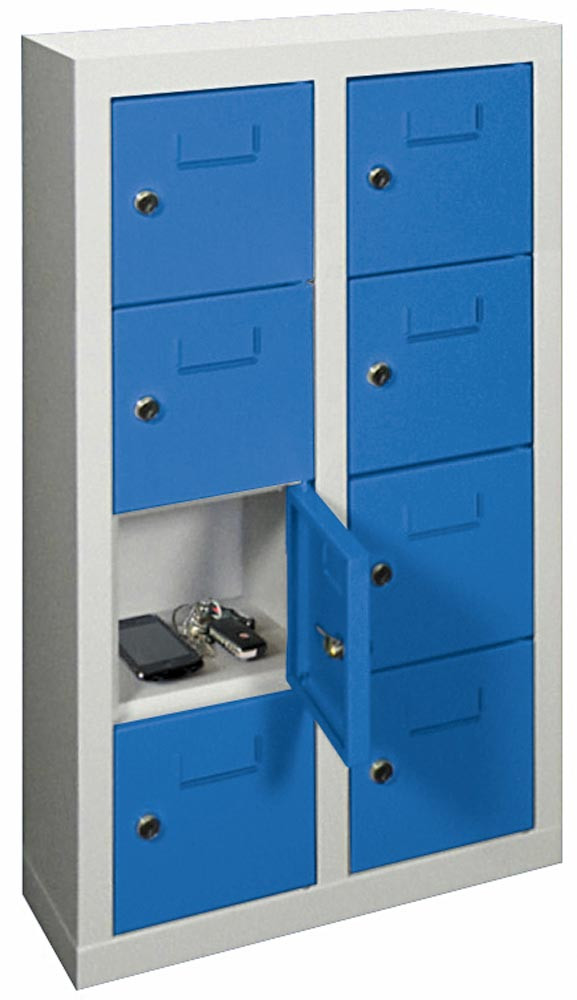 Kleinfachschrank, Wandbefestigung, BxTxH 460x200x815 mm, 2x4 Fächer, Fachbreite 145 mm, Schloss, RAL 7035/5010 lichtgrau/enzianblau E1571203