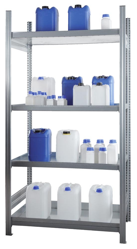 ∙ Zur Lagerung von wassergefährdenden Flüssigkeiten mit Wannenböden in jeder Lagerebene ∙ Verzinkter offener Regalrahmen mit Tiefenstreben ∙ Fachlast: 200 kg, Feldlast: bis max. 1200 kg ∙ Höhenverstellbare Lagerebenen im Raster von 25 mm