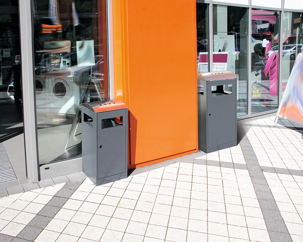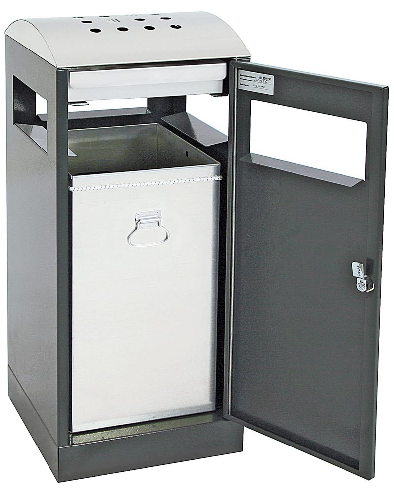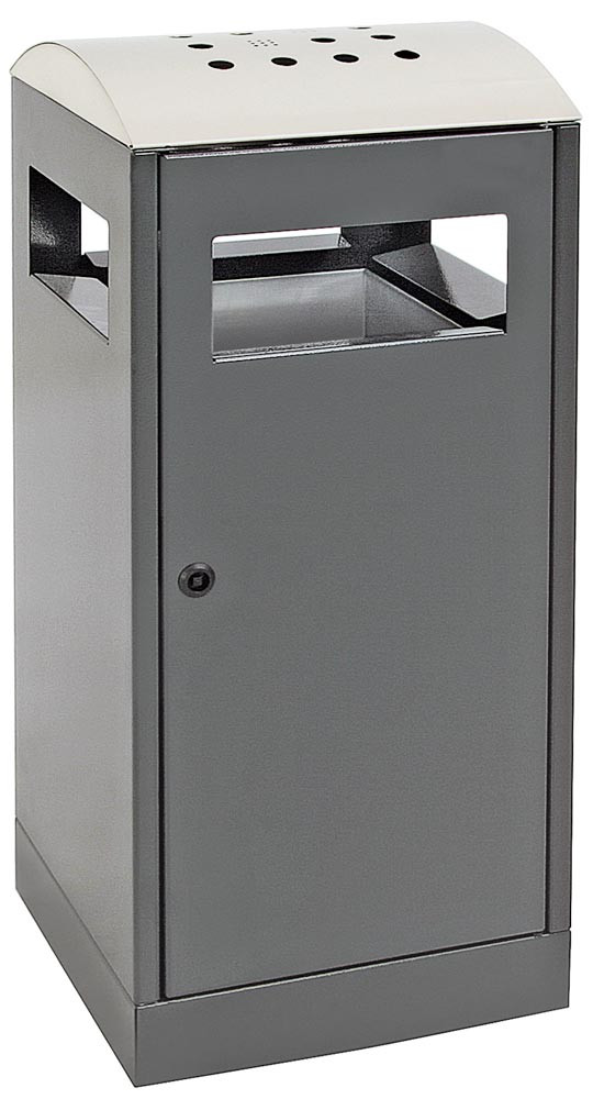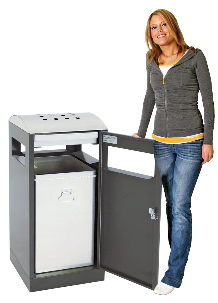 ∙ Korpus aus verzinktem Stahlblech, pulverbeschichtet RAL 7016 anthrazitgrau ∙ Mit verzinktem Innenbehälter ∙ Einwurföffnung an allen vier Seiten ∙ Niveauregulierung durch Stellfüße im Frontbereich ∙ Integrierte Ascherlade im oberen Bereich ∙ Gelochtes Kopfteil aus Edelstahl ∙ Flügeltüre per Vierkant verriegelbar ∙ Inklusive Montageprofil zu Bodenbefestigung