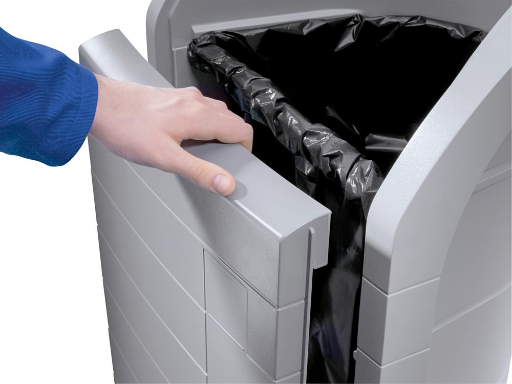 · Behälter, Klappe und Fronttür aus schlagzähem, beständigen technischem Kunststoff (ABS) · Mit extra großer Einwurfklappe · Einsetzen und Entnahme der Müllsäcke durch Öffnen der Fronttür · Stabile Halterung für Müllsäcke (120 Liter) · Einfache Reinigung des Behälters, auch Innen durch Öffnen der Fronttür · Verbindungsklammern zum Anreihen · Hohe Stabilität durch große Aufstandsfläche · Korpus in telegrau, Klappe und Front in staubgrau · Farbsticker und Piktogramme zur einfachen Mülltrennung sind im Lieferumfang enthalten