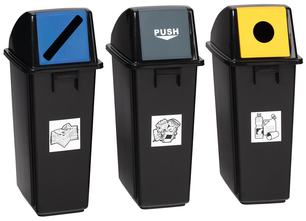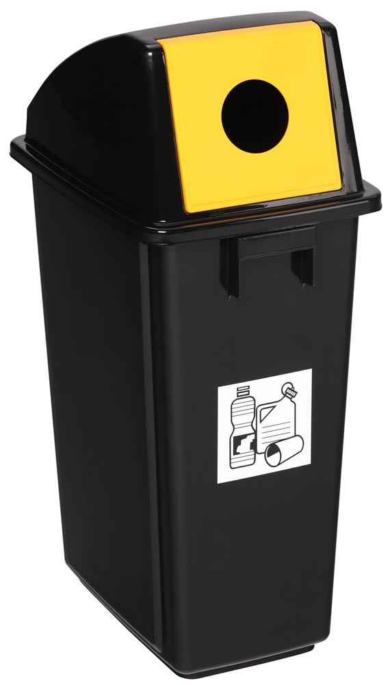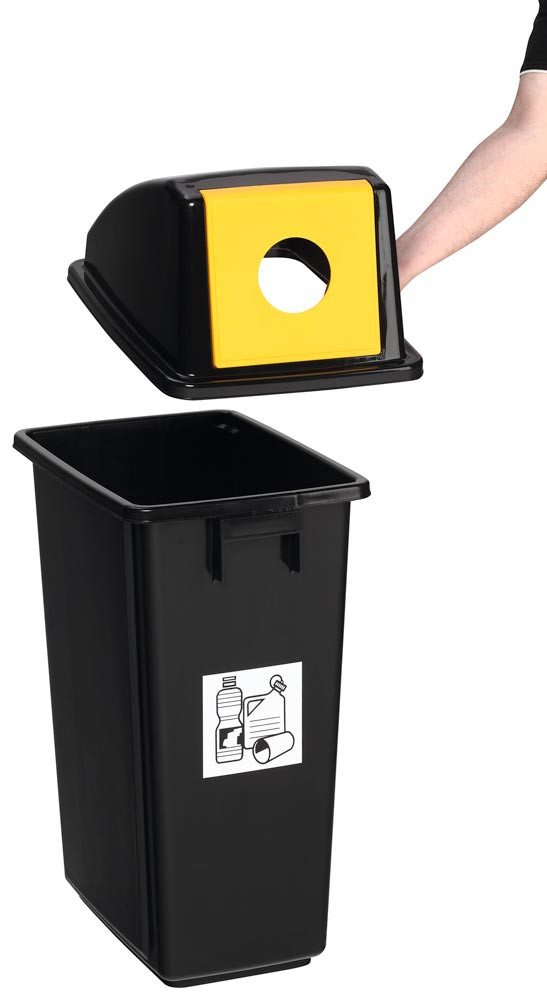 · Mit festmontierter Einwurfklappe, gelb für Wertstoffe · Inkl. Piktogramm-Aufkleber „Wertstoffe“