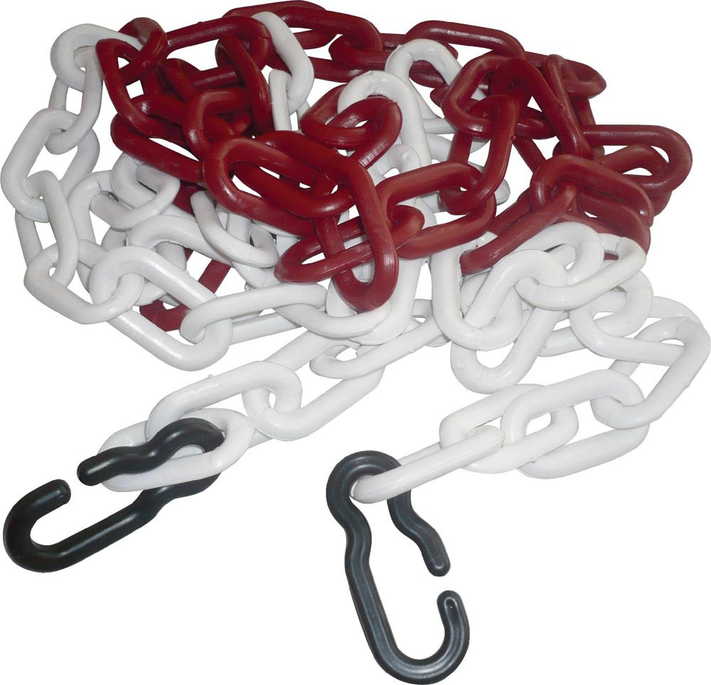 · Material Polypropylen, Flachprofil 9 mm · Farbe rot/weiß · Länge 3 m · Inkl. 2 Universalhaken je Kette · VE 3 Stück