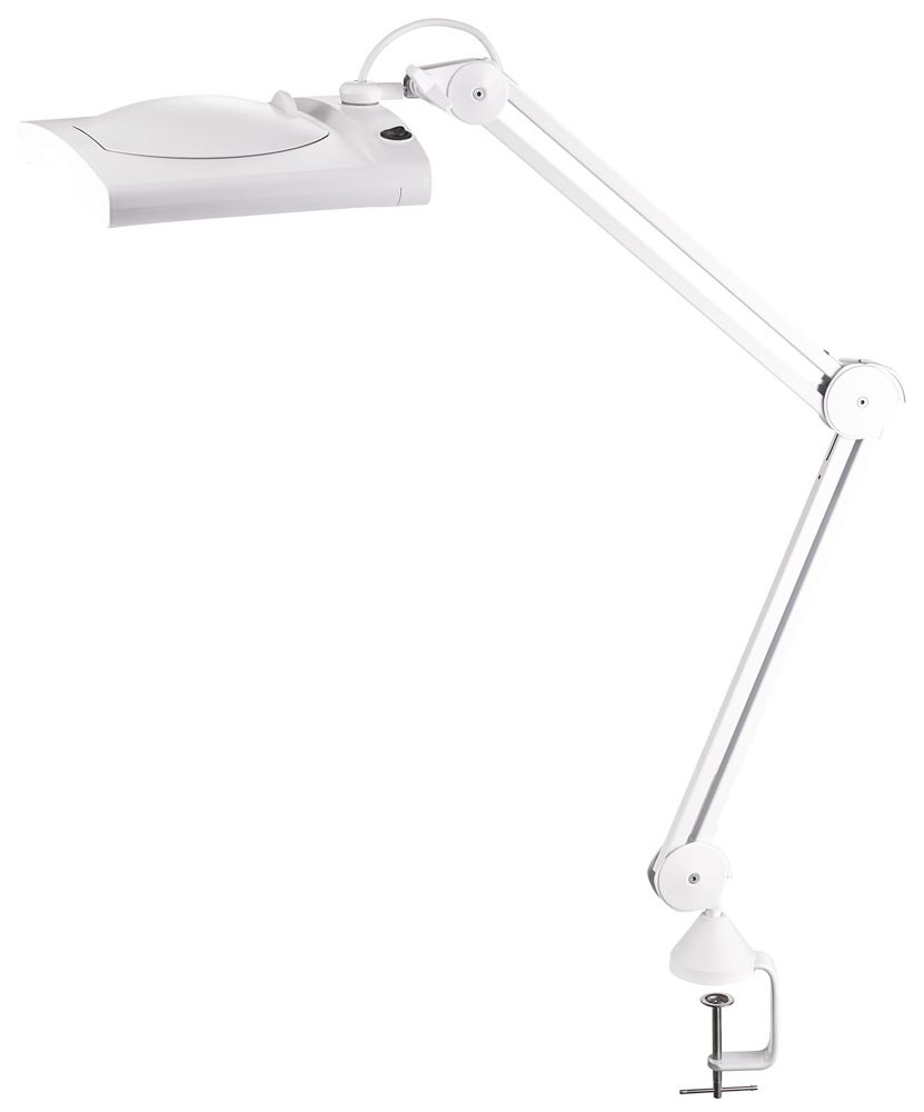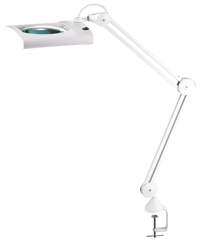 Kunststoff ∙ mit Tischklemme oder Standfuß ∙ optimale Einstellmöglichkeiten des Leuchtenarms durch 3 Gelenke, Standfuß - 2 Schenkel à 300 mm, Tischklemme - 2 Schenkel à 410 mm ∙ eckiger Kopf mit Glaslinse 190,5 mm (7,5”) x 157,48 mm (6,2”) mit Abdeckung ∙ 5 Dioptrien ∙ Betriebsspannung 230 V ∙ Lichtfarbe 6.400 Kelvin - tageslichtweiß ∙ Lichtstrom 1905 Lumen ∙ Lebensdauer - 30.000 Stunden ∙ Effizienzklasse E (Spektrum A bis G) ∙ diese Leuchte enthält eingebaute LED-Lampen ∙ die Lampen können nicht ausgetauscht werden