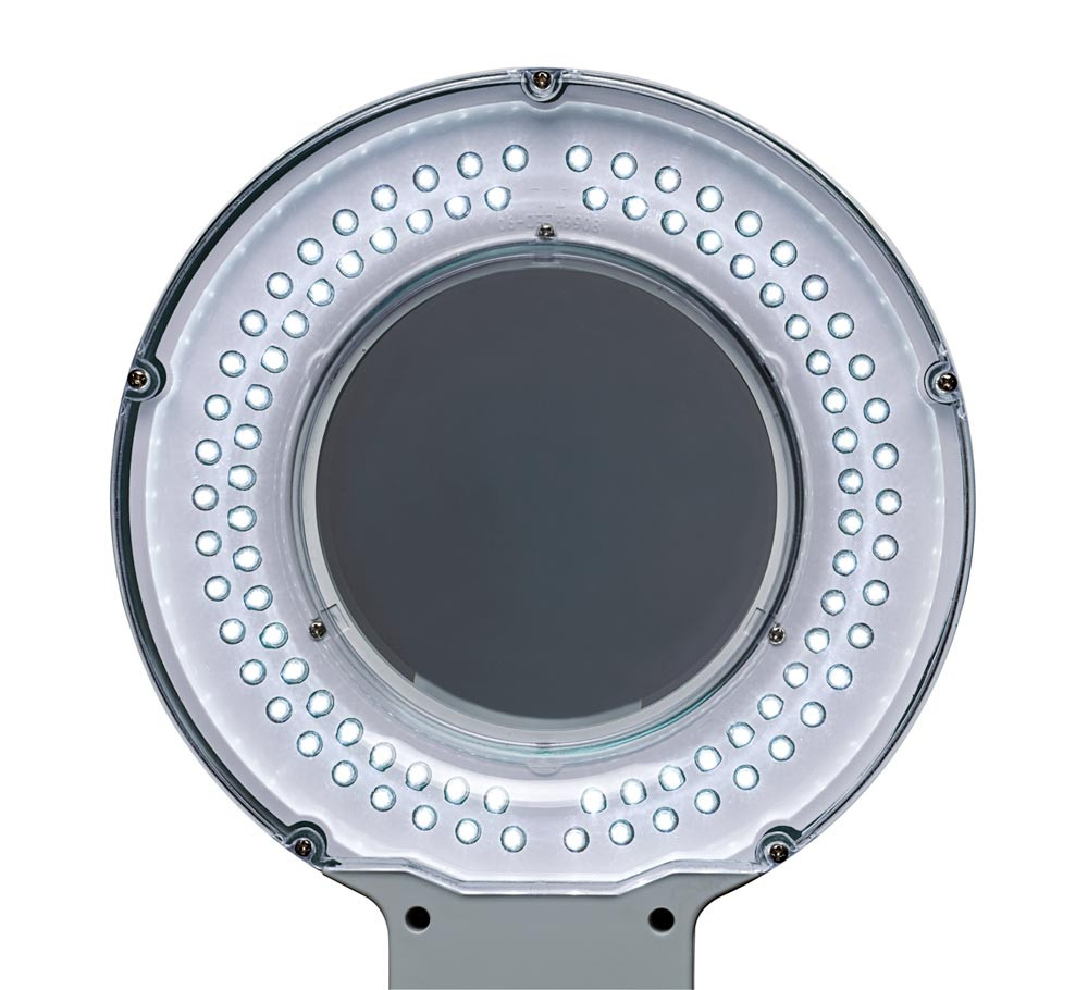 ∙ Echtglas-Linse mit 3 Dioptrien (1,75-fache Vergrößerung), Ø 5" (127 mm), Linsenfläche 144 cm2 ∙ Eine Lichtquelle, 6500 Kelvin, tageslichtweiß ∙ 2120 Lux Beleuchtungsstärke bei 350 mm Abstand, Lichtstrom je Lichtquelle 935 Lumen ∙ Die ringförmig angeordeten LEDs sorgen für schattenfreie und gleichmäßige Ausleuchtung ∙ Energieeffizienzklasse je Lichtquelle E (Spektrum A-G) ∙ Energieverbrauch 8 kWh / 1000 h