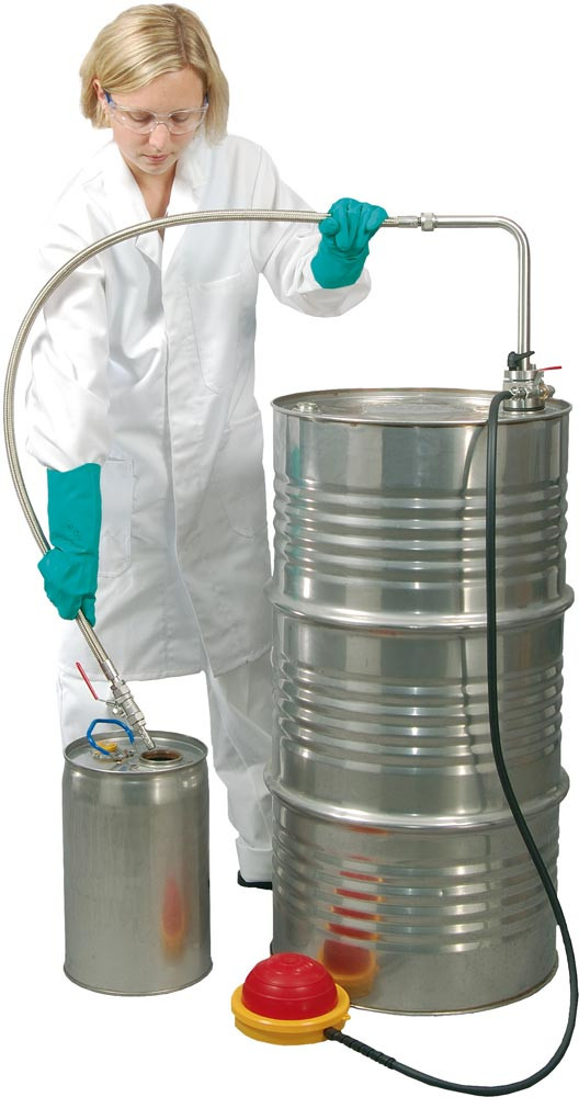 Lösemittel-Balgpumpe, Fußbetrieb, Auslaufschlauch mit Hahn, Förderleistung ca. 20 l/min, Eintauchtiefe 950 mm