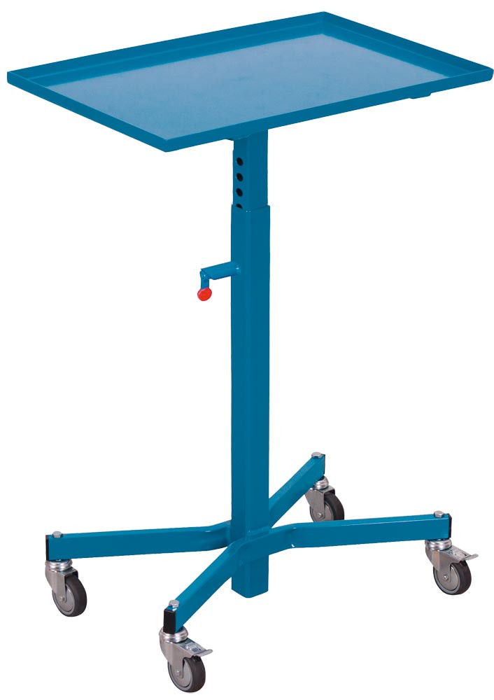 ∙ Profilstahl-Rohrkonstruktion mit umlaufendem 18 mm hohen Rand ∙ Höhenverstellung durch Rasterung mit Federriegelarretierung, Raster 25 mm ∙ Pulverbeschichtet in RAL 5010 enzianblau, dauerhafter Oberflächenschutz, schlag- und kratzfest ∙ Rollen aus thermoplastischem Gummi, grau (spurlos), Ø 75 mm ∙ 4 Lenkrollen davon 2 mit Radfeststeller