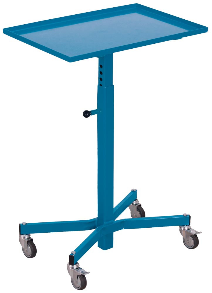 ∙ Profilstahl-Rohrkonstruktion mit umlaufendem 18 mm hohen Rand ∙ Höhenverstellung durch Rasterung mit Federriegelarretierung, Raster 25 mm ∙ Pulverbeschichtet in RAL 5010 enzianblau, dauerhafter Oberflächenschutz, schlag- und kratzfest ∙ Rollen aus thermoplastischem Gummi, grau (spurlos), Ø 75 mm ∙ 4 Lenkrollen davon 2 mit Radfeststeller
