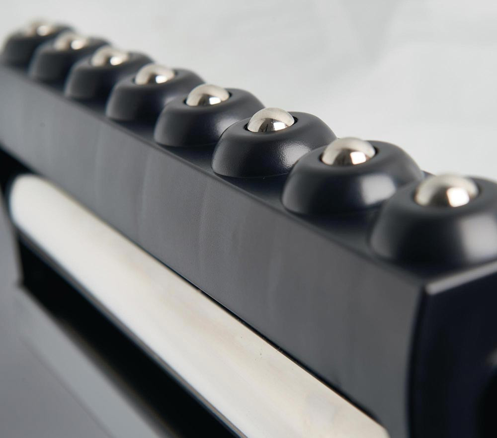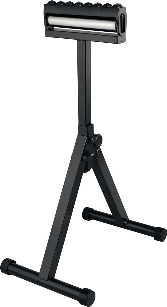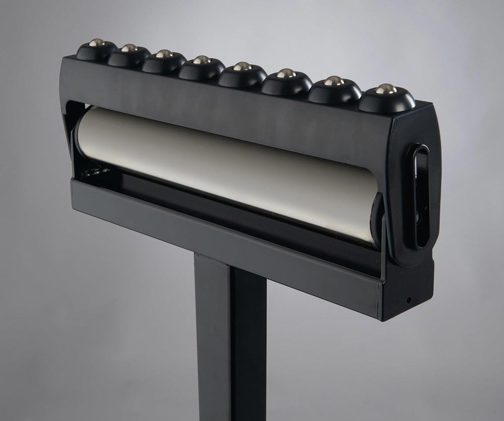 Kombiständer mit abschwenkbarem Rollenträger · Materialzufuhr über die Tragrolle oder den Kugelrollen-Träger möglich · 2-Fuß-Stahlkonstruktion, schwarz lackiert · Tragrolle Stahl verzinkt Ø 60 x 1,5mm · Kugelleiste mit 8 Kugeln · stufenlose Höhenverstellung, zusammenklappbar · Niveauausgleich für unebene Böden · Tragfähigkeit 200 kg