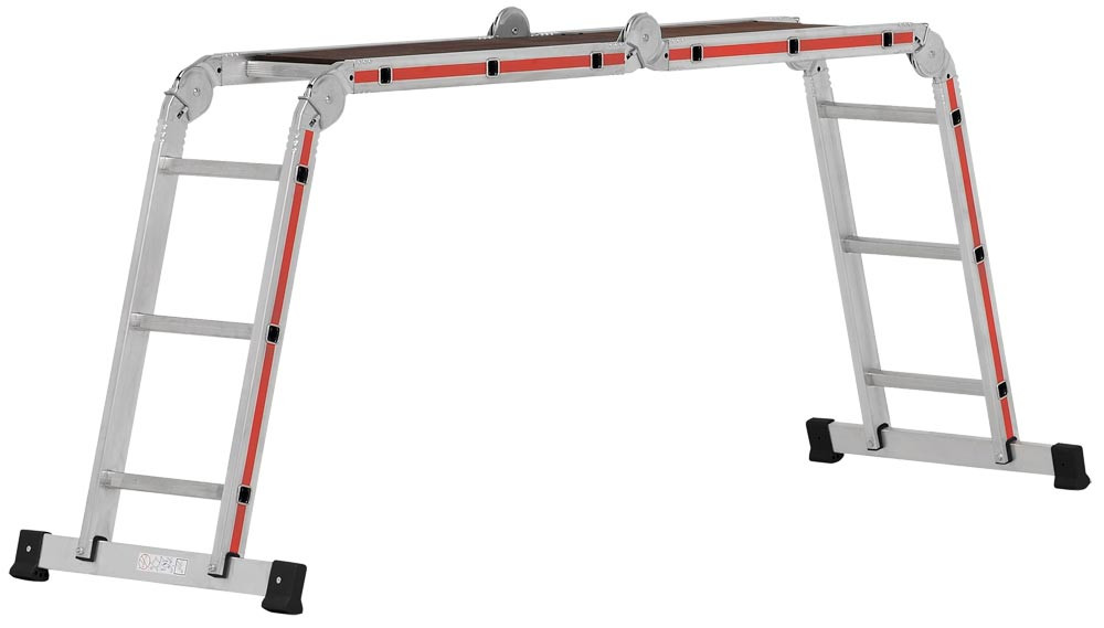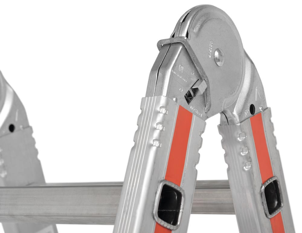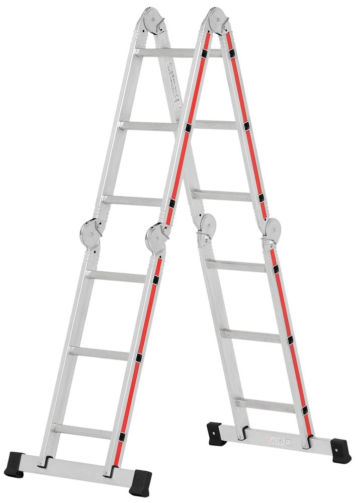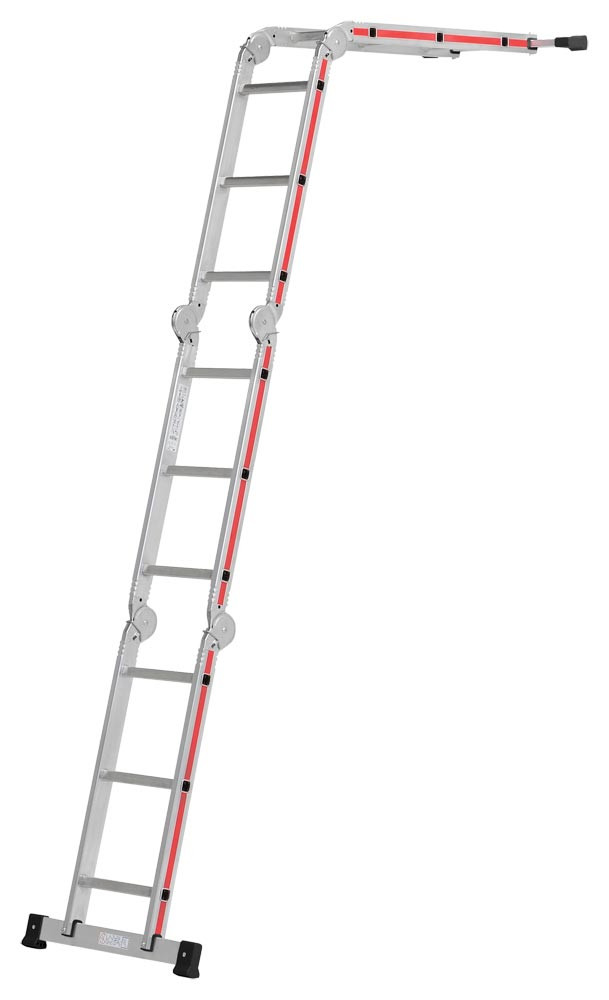 ∙ Der 4-teilige Alleskönner ∙ Universell einsetzbare Mehrzweckleitern mit sechs Sicherheitsgelenken ∙ Automatisches Einrasten der Gelenke in jeder Position ∙ Sprossen aus Walzprofil ∙ Geringer Platzbedarf bei Lagerung und Transport ∙ Stabile Traverse für hohe Standsicherheit · Zulässige Belastung 150 kg · Entspricht EN 131-4