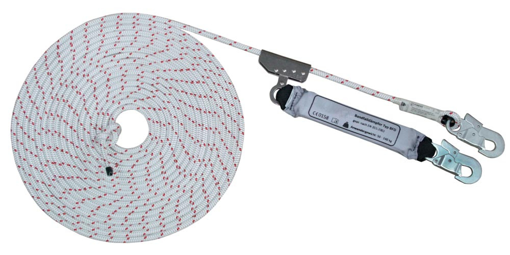 · Zugelassen nach EN 353-2:2002 ∙ Mit Stahl-Karabinerhaken am Seil ∙ Strapazierfähiges Kernmantelseil, Ø 12 mm ∙ Leichtgängiger Läufer ∙ Kantengeprüft (horizontale Verwendung zulässig) ∙ Für Anwendergewicht von 50-140 kg