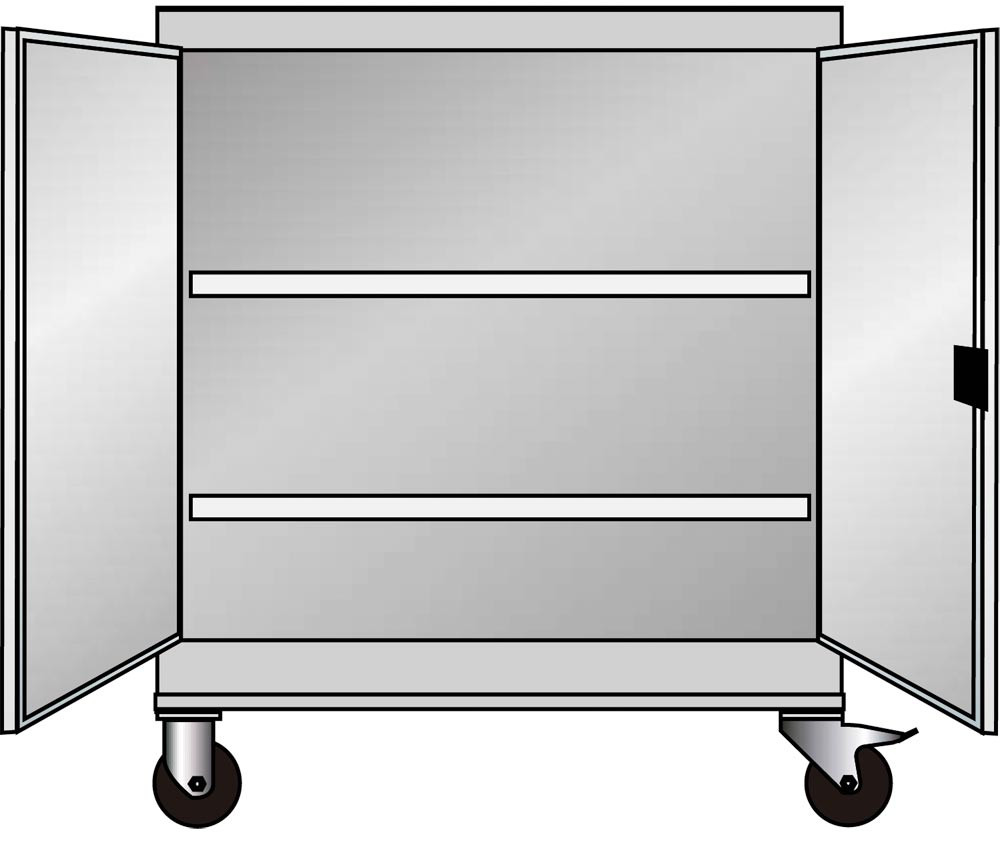 Mobiler Flügeltürenschrank, Vollblechtüren, BxTxH 1005x500x1195 mm, 2 Fachböden, verzinkt, TL 100 kg, RAL 7035/5012 E6409472
