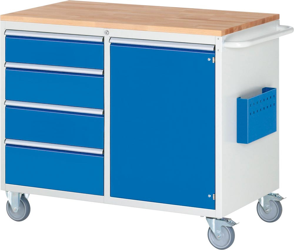 Montagewagen mit Buche Platte 25 mm, BxTxH 1145x650x975 mm, 4 Schubladen 1x150, 2x180, 1x210 mm, 1x Flügeltür 720mm, RAL 7035/5010