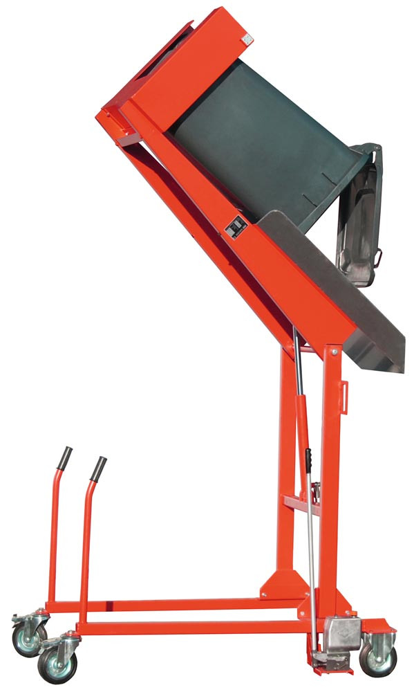 · Zur Entleerung und Reinigung von 120- und 240 Liter Mülltonnen · Kippwinkel bis 135° · Ausschütthöhe ca. 1480 mm · 2 Lenk- und 2 Bockrollen aus Vollgummi, Ø 180 mm, Lenkrollen mit Feststeller, Bauhöhe 225 mm · Traglast 110 kg