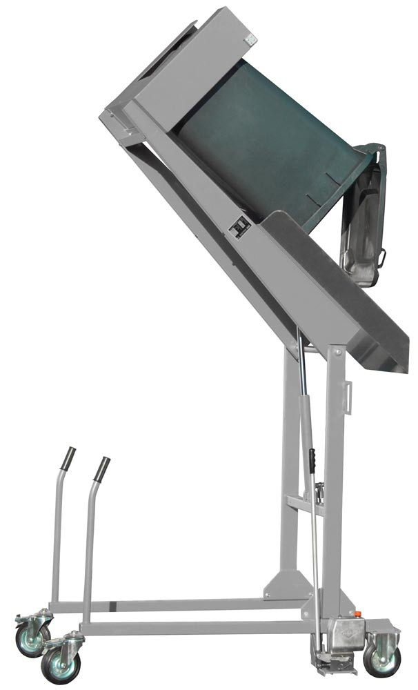 · Zur Entleerung und Reinigung von 120- und 240 Liter Mülltonnen · Kippwinkel bis 135° · Ausschütthöhe ca. 1480 mm · 2 Lenk- und 2 Bockrollen aus Vollgummi, Ø 180 mm, Lenkrollen mit Feststeller, Bauhöhe 225 mm · Traglast 110 kg