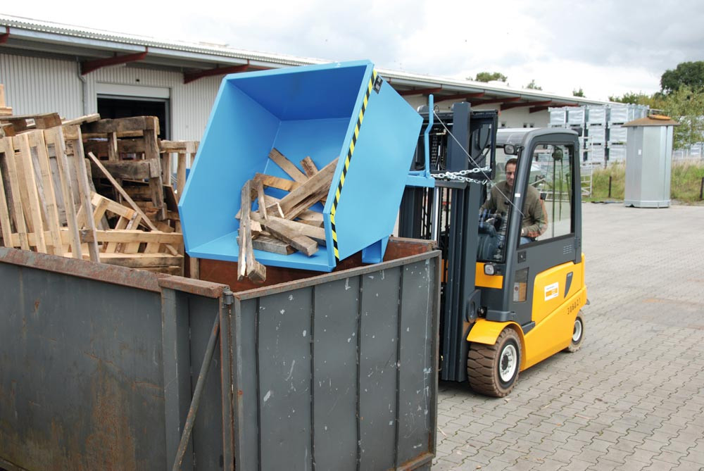 · Wannenblech mit umlaufenden Randprofil · Stabiler Grundrahmen mit Einfahrtaschen · Sicherung gegen unbeabsichtigtes Abrutschen oder Auskippen · Günstiger Kippwinkel · Kippen in jeder Höhe per Seilzug möglich