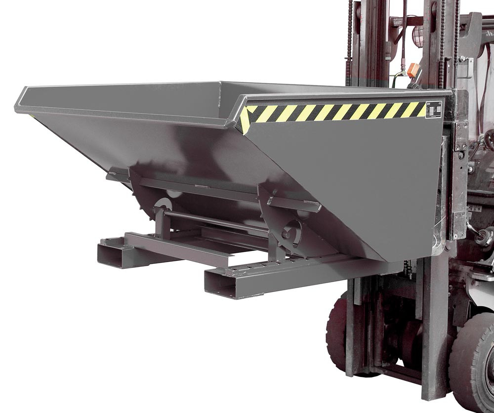 ∙ Mit Abrollsystem ∙ Mit kippbarer Mulde, 3 mm Wannenblech mit umlaufendem Randprofil ∙ Günstiger Lastschwerpunkt, Kippen in jeder Höhe per Seilzug ∙ Sicherung gegen unbeabsichtigtes Abrutschen und Auskippen ∙ Robuste Stahlblechkonstruktion ∙ Stabiler Grundrahmen mit Einfahrtaschen