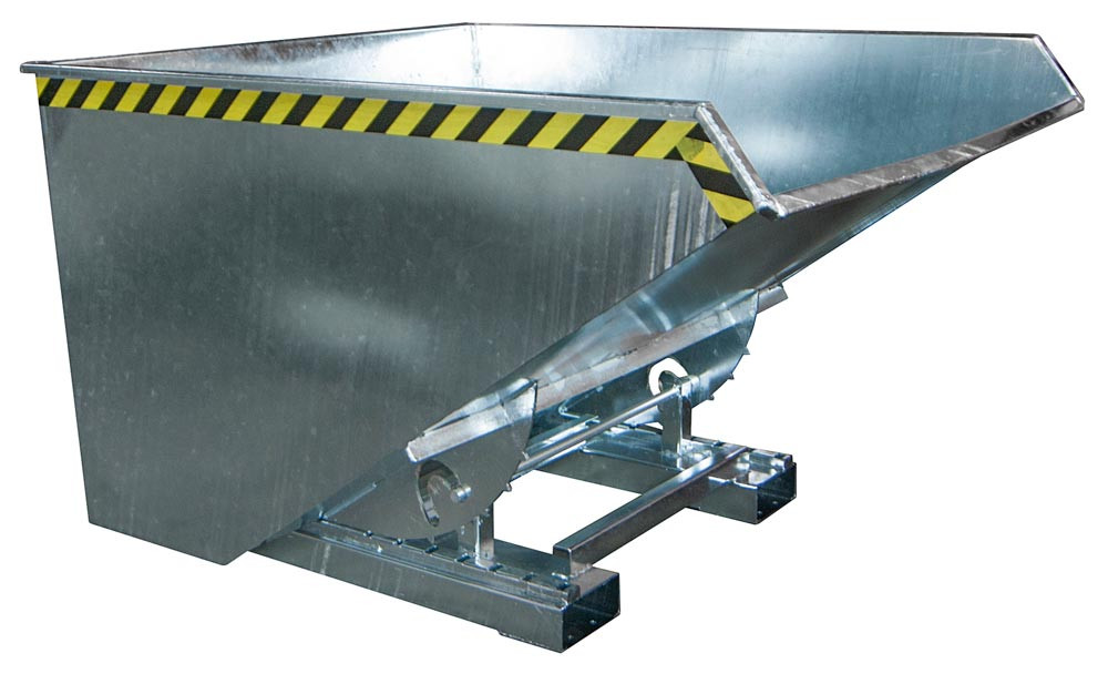 ∙ Mit Abrollsystem ∙ Mit kippbarer Mulde, 3 mm Wannenblech mit umlaufendem Randprofil ∙ Günstiger Lastschwerpunkt, Kippen in jeder Höhe per Seilzug ∙ Sicherung gegen unbeabsichtigtes Abrutschen und Auskippen ∙ Robuste Stahlblechkonstruktion ∙ Stabiler Grundrahmen mit Einfahrtaschen