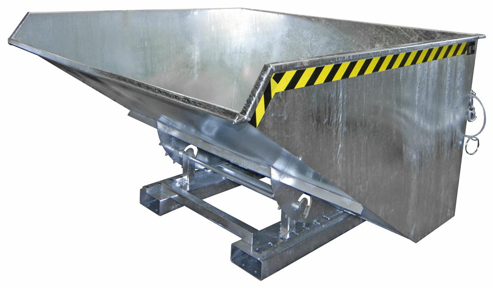 ∙ Mit Abrollsystem ∙ Mit kippbarer Mulde, 3 mm Wannenblech mit umlaufendem Randprofil ∙ Günstiger Lastschwerpunkt, Kippen in jeder Höhe per Seilzug ∙ Sicherung gegen unbeabsichtigtes Abrutschen und Auskippen ∙ Robuste Stahlblechkonstruktion ∙ Stabiler Grundrahmen mit Einfahrtaschen