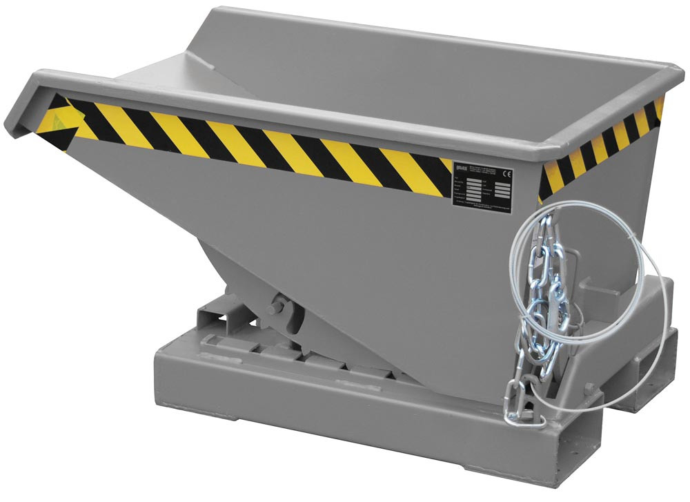 · Niedrige Schüttkantenhöhe von 455 mm ∙ Mit Abrollsystem ∙ Mit kippbarer Mulde, 3 mm Wannenblech mit umlaufendem Randprofil ∙ Günstiger Lastschwerpunkt, Kippen in jeder Höhe per Seilzug ∙ Sicherung gegen unbeabsichtigtes Abrutschen und Auskippen ∙ Robuste Stahlblechkonstruktion ∙ Stabiler Grundrahmen mit Einfahrtaschen