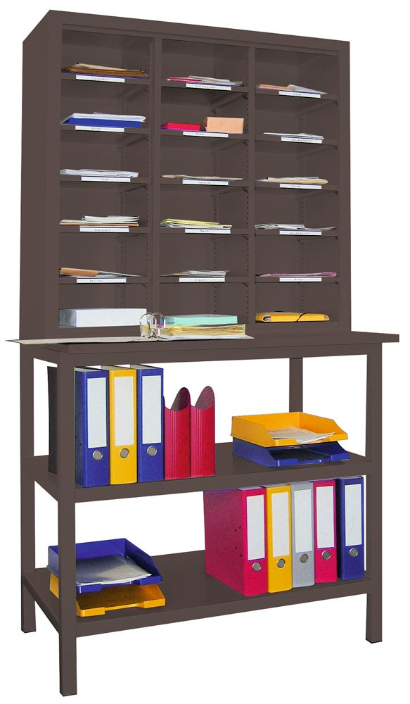 Ordnungsregal, BxTxH 1000x700x1950 mm, 3x6 Fächer, Regaltiefe 400 mm, Ablagetisch HxT 950x600 mm mit 2 Böden, RAL 7016 anthrazit
