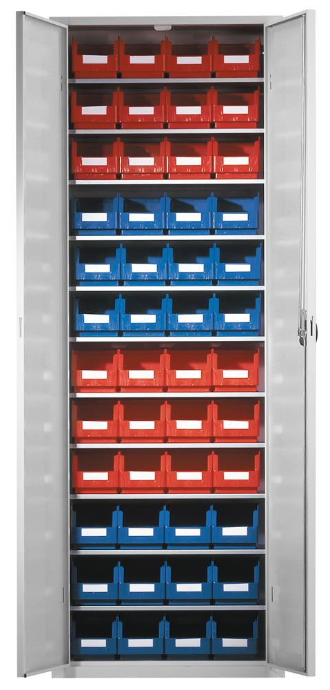 · Solide, innen und aussen schlag- und kratzfeste Stahlkonstruktion mit Kunststoffbeschichtung in RAL 7035 lichtgrau · Fachböden aus verzinktem Stahlblech, im Raster von 15 mm verstellbar · Tür-Öffnungswinkel über 180° · Dreiriegeliges Sicherheits-Zylinderschloss mit versenkbarem Drehgriff · Die Bestückung mit Sichtlagerkästen erfolgt je Größe und farblich sortiert