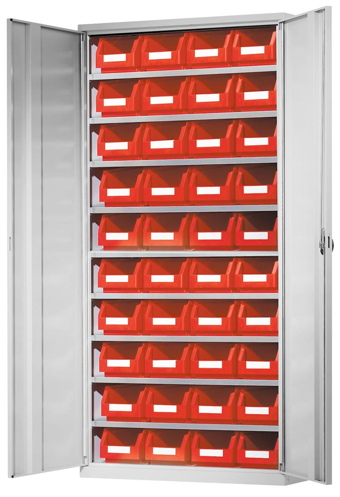 · Solide, innen und aussen schlag- und kratzfeste Stahlkonstruktion mit Kunststoffbeschichtung in RAL 7035 lichtgrau · Fachböden aus verzinktem Stahlblech, im Raster von 15 mm verstellbar · Tür-Öffnungswinkel über 180° · Dreiriegeliges Sicherheits-Zylinderschloss mit versenkbarem Drehgriff · Die Bestückung mit Sichtlagerkästen erfolgt je Größe und farblich sortiert