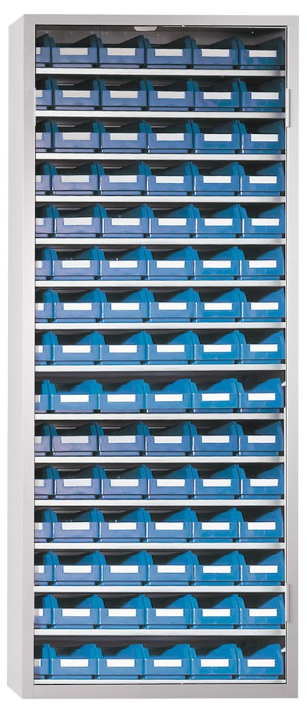 · Solide, innen und aussen schlag- und kratzfeste Stahlkonstruktion mit Kunststoffbeschichtung in RAL 7035 lichtgrau · Fachböden aus verzinktem Stahlblech, im Raster von 15 mm verstellbar · Tür-Öffnungswinkel über 180° · Dreiriegeliges Sicherheits-Zylinderschloss mit versenkbarem Drehgriff · Die Bestückung mit Sichtlagerkästen erfolgt je Größe und farblich sortiert