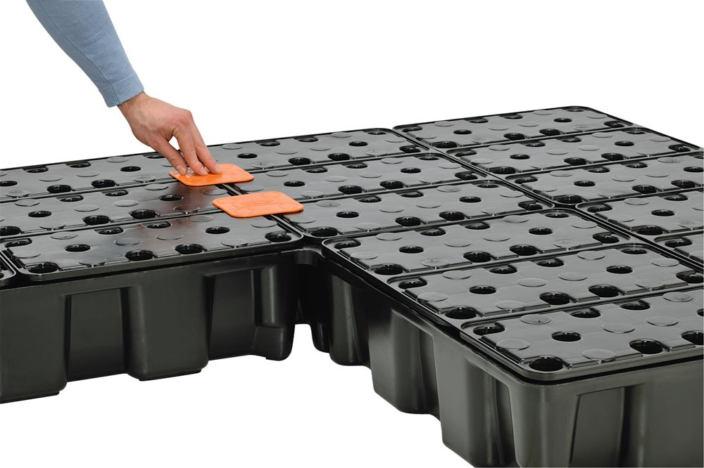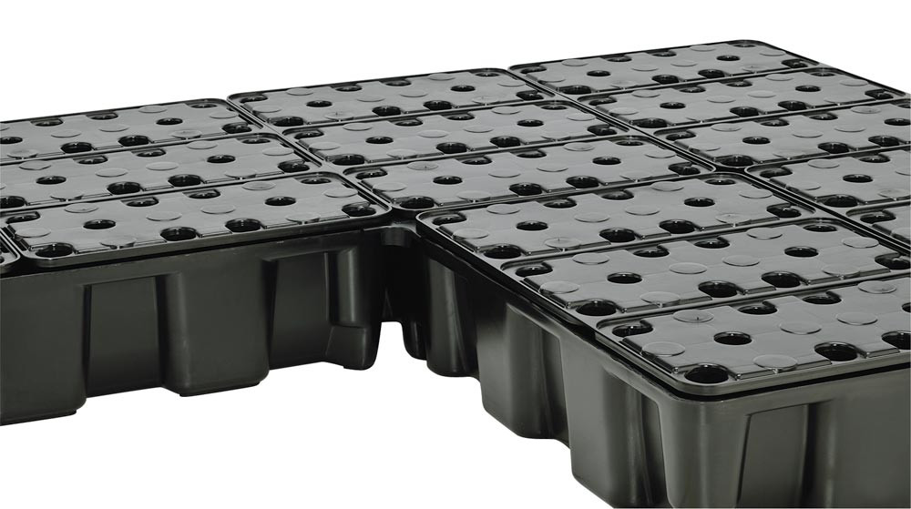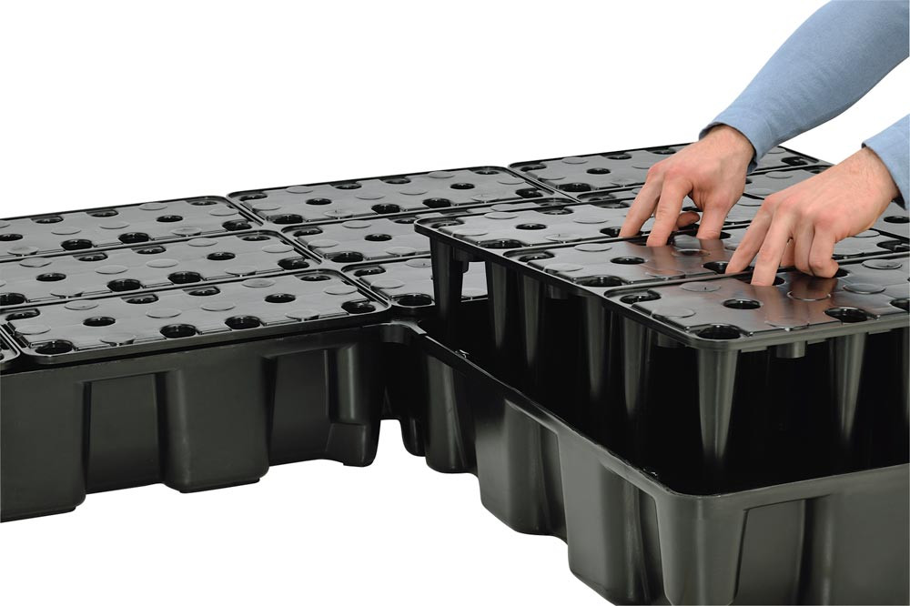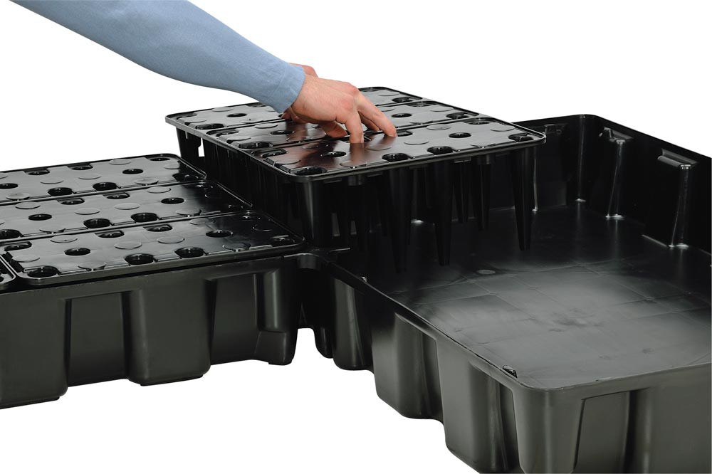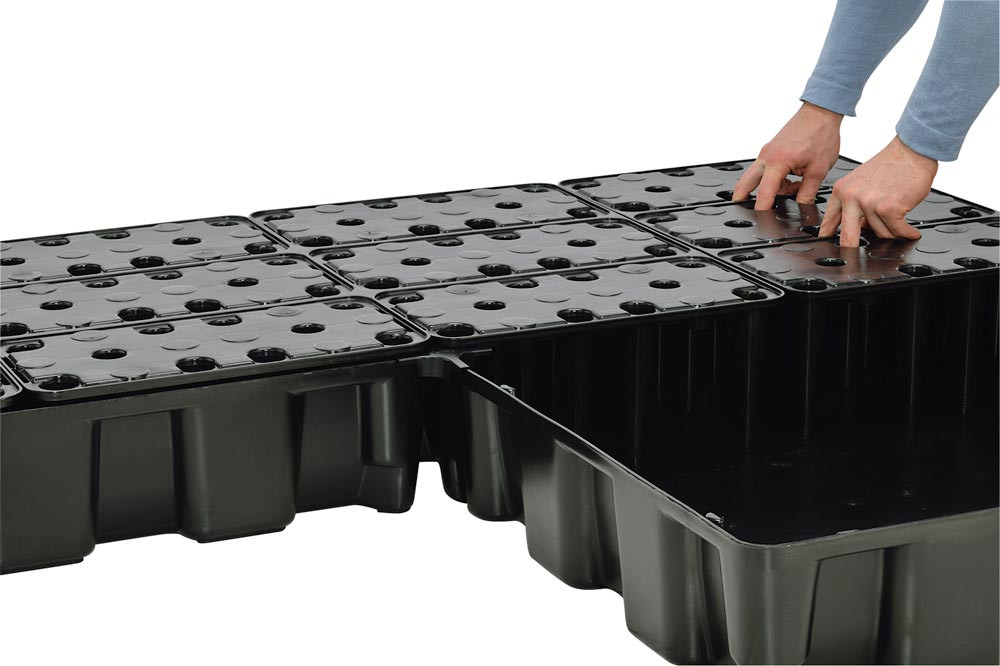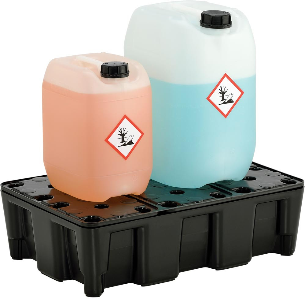 für Kleingebinde · zur sicheren und vorschriftsmäßigen Lagerung gewässergefährdenden Flüssigkeiten der GHS-Kategorien 1-4 · aus HD-Polyethylen · sehr beständig gegen Laugen, Öle und Säuren · stapelbar · rutschsichere Plattenoberfläche · konzipiert für Kombination auf Europalette · mit DIBT-Zulassung Nr. Z-40.22-548 und Z-40.22-549