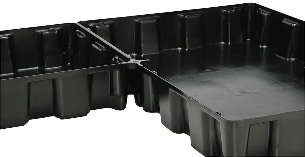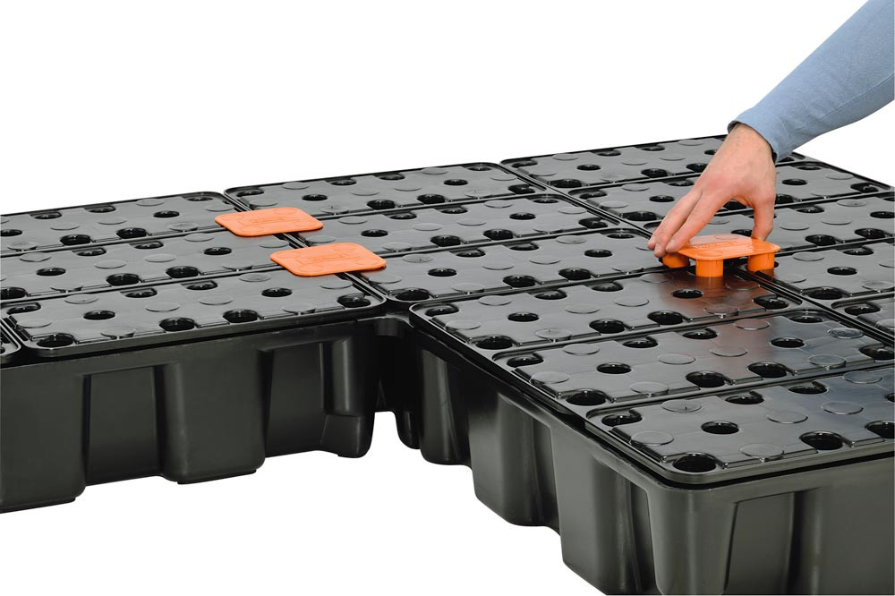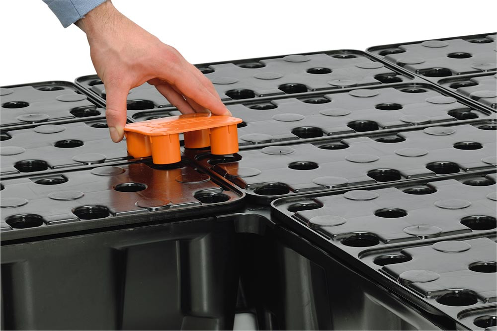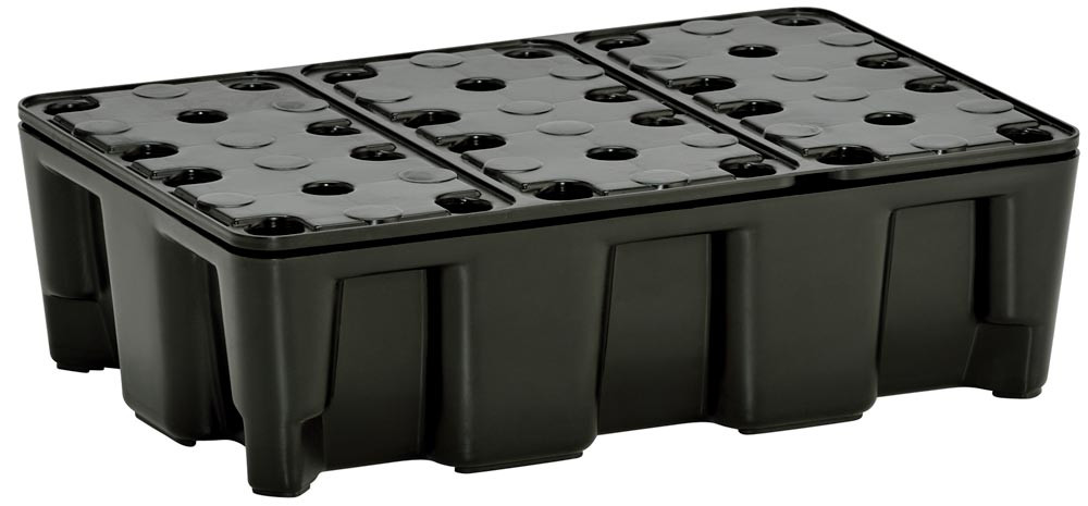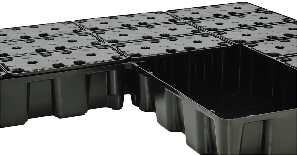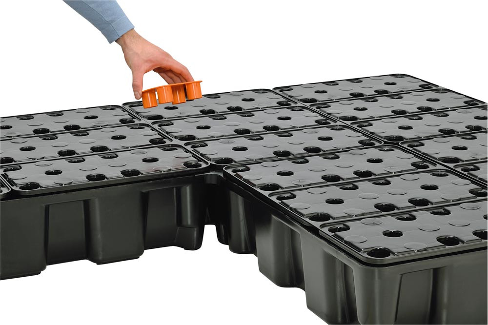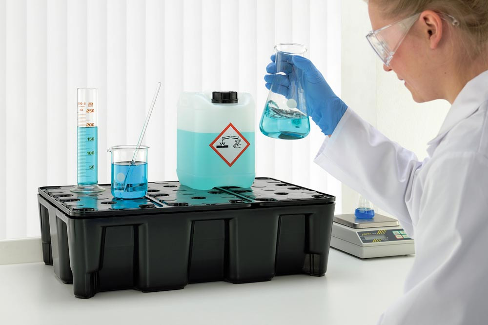 für Kleingebinde · zur sicheren und vorschriftsmäßigen Lagerung gewässergefährdenden Flüssigkeiten der GHS-Kategorien 1-4 · aus HD-Polyethylen · sehr beständig gegen Laugen, Öle und Säuren · stapelbar · rutschsichere Plattenoberfläche · konzipiert für Kombination auf Europalette · mit DIBT-Zulassung Nr. Z-40.22-548 und Z-40.22-549