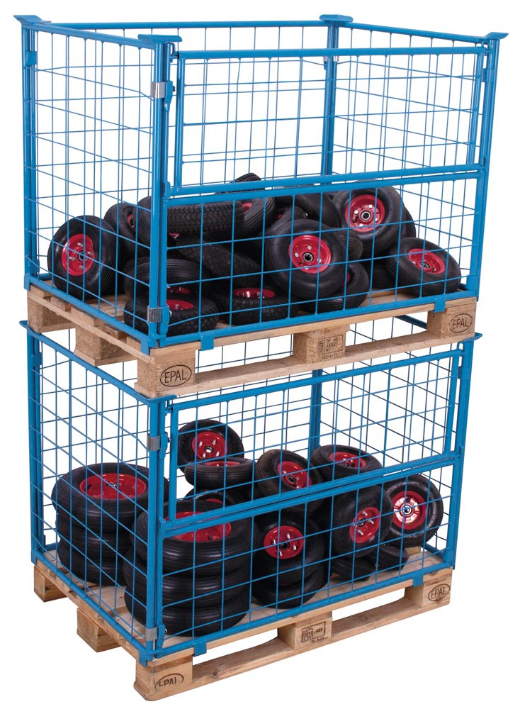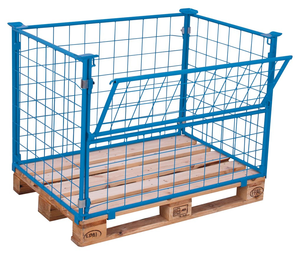 Palettenaufsatz, Höhe 800 mm, für Paletten 1000x1200 mm, Auflast 1000 kg, RAL 5012 lichtblau, mit 3 festen und 1 halb abklappbaren Wand E833865