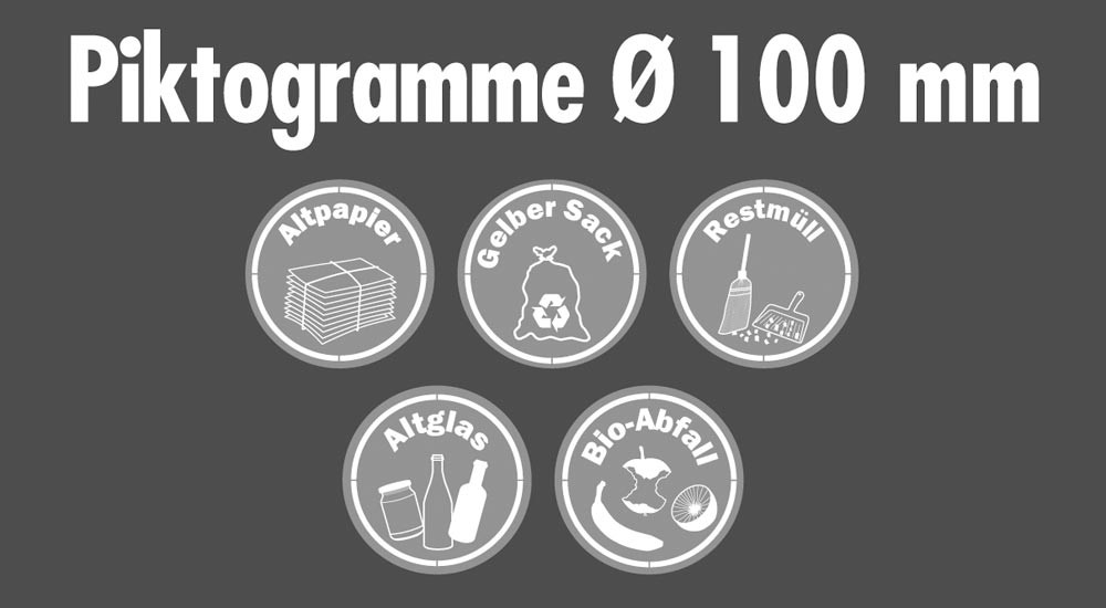 Piktogramme, Durchm. 100 mm, selbstklebend, wasserfest, transparent, Aufdruck weiß, Set mit 5 Stück