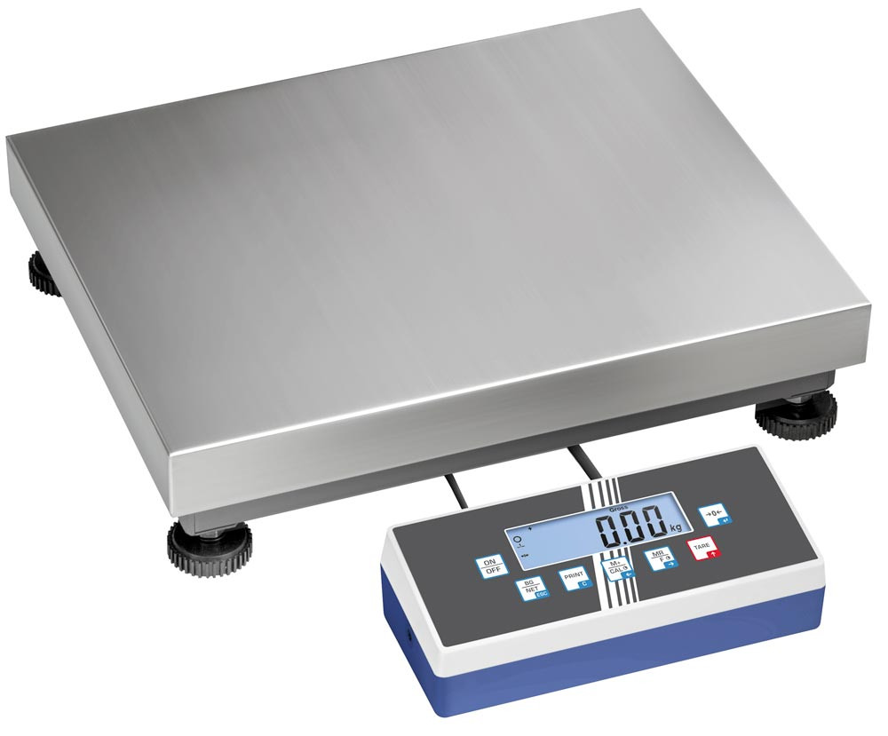 · Eichfähig · Libelle und Fußschrauben zum exakten Nivellieren der Waage - dadurch genaueste Wägeergebnisse · Wägeplatte aus Edelstahl, Unterbau aus lackiertem Stahl · Silikonbeschichtete Aluminium-Wägezelle · Staub- und Spritzwasserschutz nach IP65