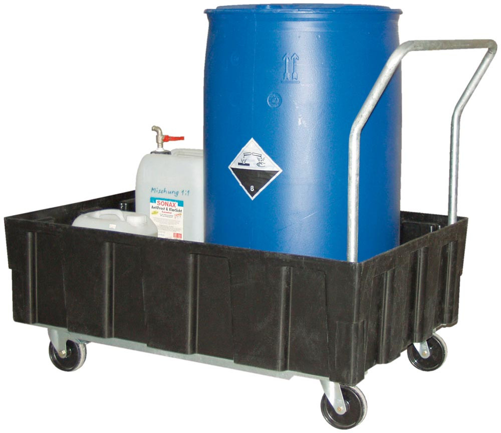 Polyethylen-Auffangwanne mit 2 Lenk- und 2 Bockrollen, mit PE-Lochblech, BxTxH 1290x805x1040 mm, Vol. 224 l E813167