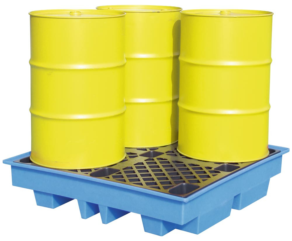 Polyethylen-Auffangwanne mit Einfahrtaschen und PE-Palette, BxTxH 1280x1280x275 mm, blau, Auffangvolumen 230 l, Gewicht 25 kg, Traglast 1250 kg