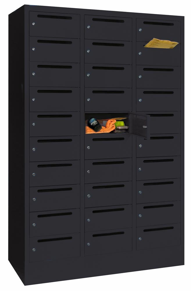 Postverteilschrank, BxTxH 900x500x1850 mm, 3x10 Fächer, Fachbreite 300 mm, Schloss, Sockel, RAL 7016 anthrazit