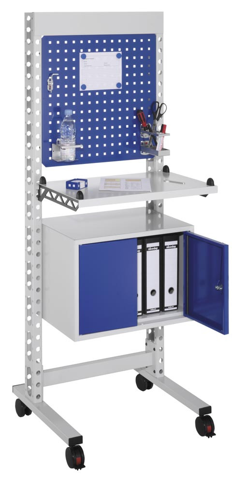 Version ∙ Stationen werden mit 4 Lenkrollen (Ø 75 mm; 2 mit Feststeller) geliefert ∙ Grundgestell ist eine stabile Rahmenkonstruktion aus Stahlprofilen, die zugleich als Kabelführung dienen ∙ Modularer Aufbau ermöglicht auch eine eigene Zusammenstellung der Konfiguration ∙ Die Tischplatten, Ablageböden sowie Schrank- und Schubladenmodule lassen sich, im 50 mm Raster, in der gewünschten Höhe sicher einhängen bzw. montieren · Korpus in RAL 7035 lichtgrau und Front in RAL 5010 enzianblau beschichtet