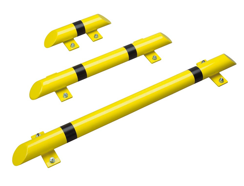 Rammschutz-Balken, Rohrdurchm. 76 mm, LxH 800x85 mm, pulverbeschichtet RAL 1018 zinkgelb mit schwarzer Warnmarkierung