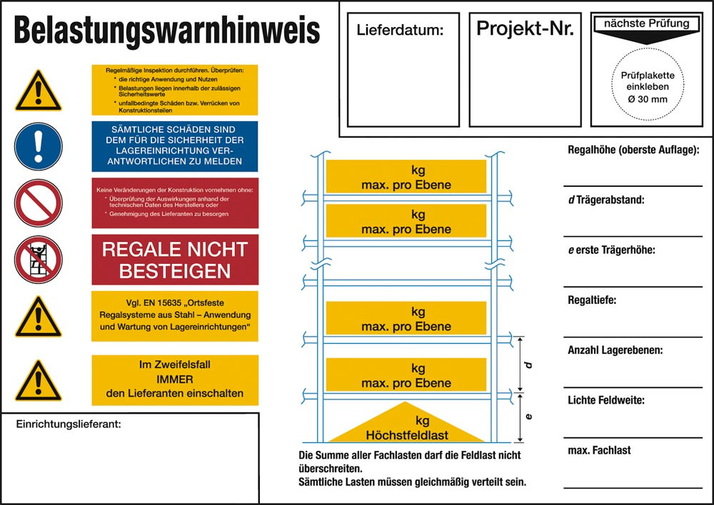 | Ausführung Warnschild | Belastungswarnhinweis für Fachbodenregal |