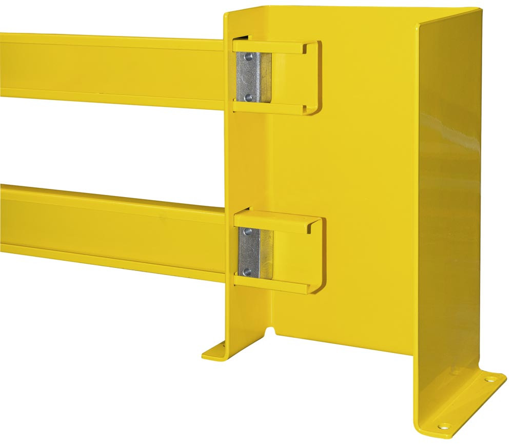 · Stirnseitiger Schutz der Regale und Hochregale vor Anfahrschäden durch Stapler- und Rangierverkehr · Gesamtschutzhöhe 500 mm · Ein Planken-Set bestehend aus zwei Anfahrschutzwinkeln (B x T x H 300 x 190 x 500 mm), zwei Planken mit C-Profil und vier Klemmstücken · Verschieben der Planken von 200 mm je Seite möglich · Kunststoffbeschichtet in gelb/schwarz