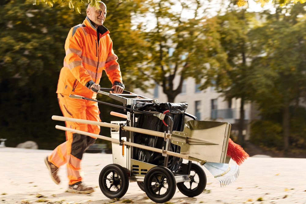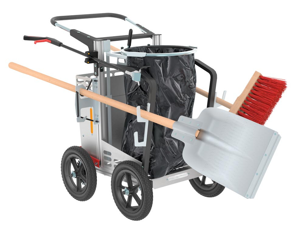 · Aus Aluminium, pulverbeschichteter Profilrahmen aus verzinktem Stahl · Zwei Achsen und große pannensichere Räder · Feststellbremse · Inklusive Müllsackhalterung, Aluminiumschaufel, Straßenbesen und passenden Stielen · Für die kommunale Außenreinigung und den professionellen Einsatz · Waagerechte Halterung von bis zu vier Stielgeräten mit bequemem Zugang, eine senkrechte Stieltasche · Abschließbares Handfach mit offener Ablage · Höhenverstellbarer Griff