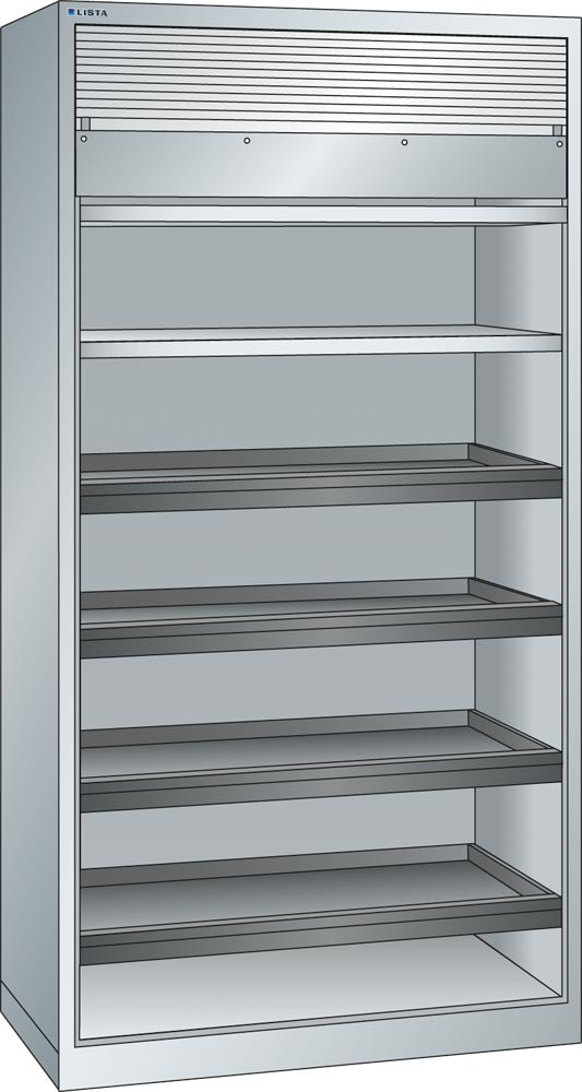 Rollladenschrank, BxTxH 1000x580x1950 mm, 2 Verstellböden, 2 Auszugböden, 1 Schublade, RAL 5012, Rolllade grau E835081