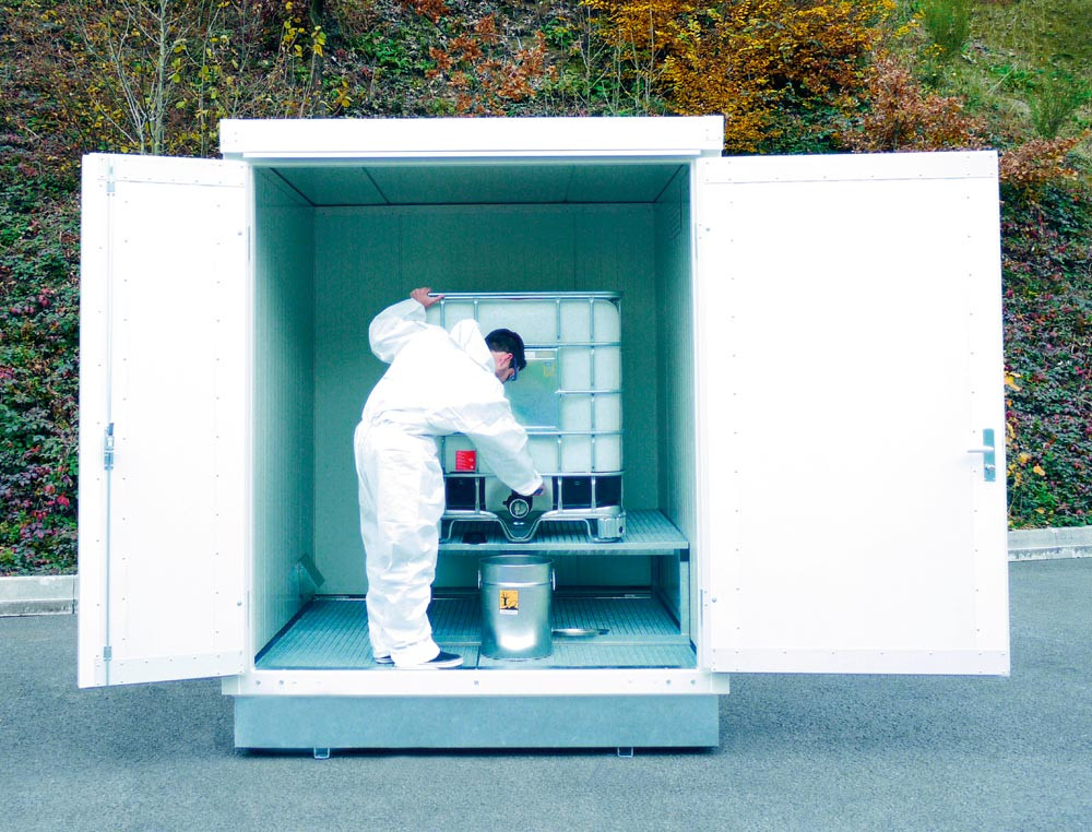 ∙ Nach den Anforderungen des Wasserhaushaltsgesetzes ∙ Wände und Dach aus stabilen, verzinkten Trapezblechen mit integrierter Regenrinne ∙ Große Doppelflügeltüren erleichtern das Ein- und Auslagern von Gebinden ∙ Tür mit Sicherheitsschloss ∙ Zugelassen für alle wassergefährdenden Stoffe (GHS Symbol 1-4) und alle brennbaren Stoffe (GHS Symbol 1-3) ∙ Wanne aus 3 mm Stahlblech (S235JR) flüssigkeitsdicht verschweißt, verzinkt ∙ Rundum Einleitbleche als Spritzschutz ∙ Herausnehmbare, hochbelastbare Gitterroste · Max. Verkehrslast auf der Wanne 1000 kg/qm