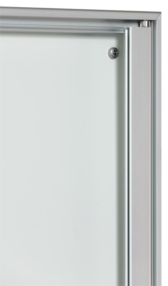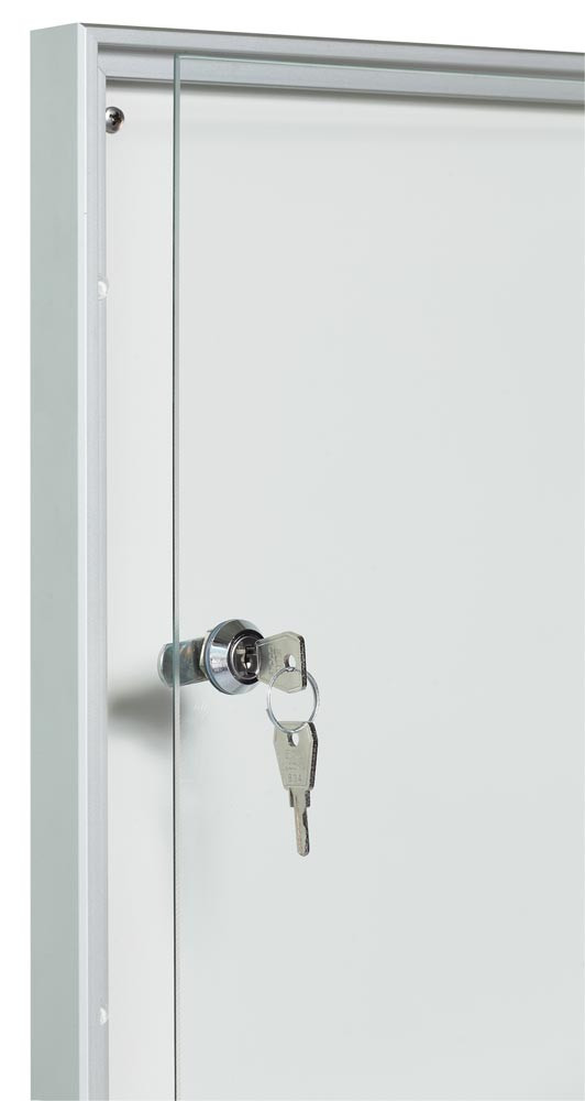 · Aus Aluminium-Profilen · Bautiefe 27 mm · Rückwand magnethaftend, Farbe grauweiß · Frontscheibe aus Einscheiben-Sicherheitsglas (ESG) · Öffnung mit Drehflügel seitlich nach rechts · Abschließbar · Entsprechen den Brandschutzbestimmungen B1 · Lieferung ohne Schriftleiste